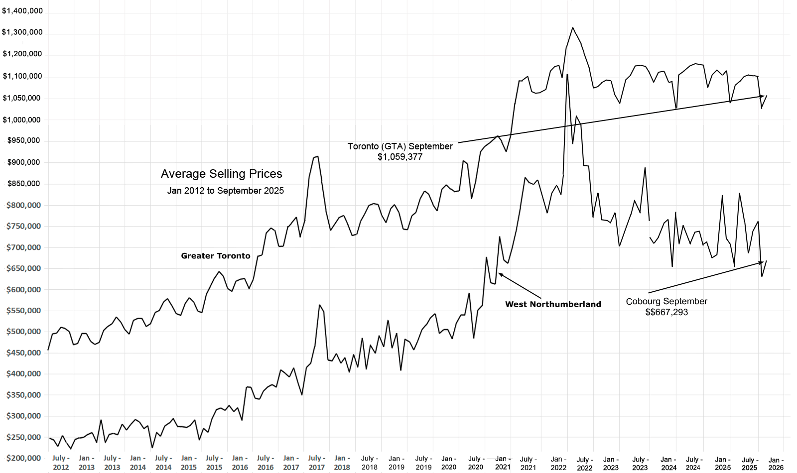 Prices for GTA have been virtually flat since July 2021 but Cobourg prices are noticeably down - with more volatility due to the smaller market - see graph.